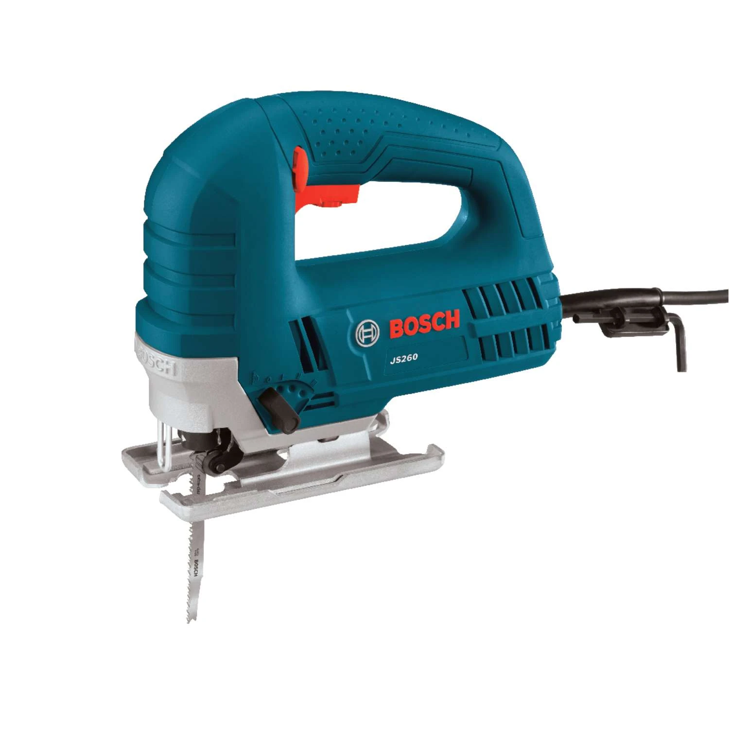 The Bosch JS260 Top-Handle Jig Saw provides a sturdy footplate for accuracy in the cut, as well as a 6.0-amp motor and variable-speed control. The sturdy motor produces up to 3100 strokes per minute, with a 3/4 In. stroke length. The variable-speed dial controls the maximum speed, while the accelerator trigger regulates the operating speed. This jig saw is engineered with a low-vibration plunging design for cutting accuracy and smooth operation. It has a large heavy-gauge steel footplate. The JS260’s multidirectional blade clamp delivers the superior grip of T-shank blades (but it does not accept U-shank blades). The toolless T-shank blade-change system makes blade insertion and removal quick. The tool has an always-on dust blower for max cut-line visibility and an ambidextrous lock-on button. Four orbital-action settings – provides varied blade strokes for smooth to aggressive cuts Precision-machined plunging mechanism and low-vibration design – delivers enhanced accuracy and extremely smooth operation Ergonomic top handle and two-finger trigger – allows for a solid, comfortable grip Ambidextrous lock-on button – for steady long cuts and user comfort and control