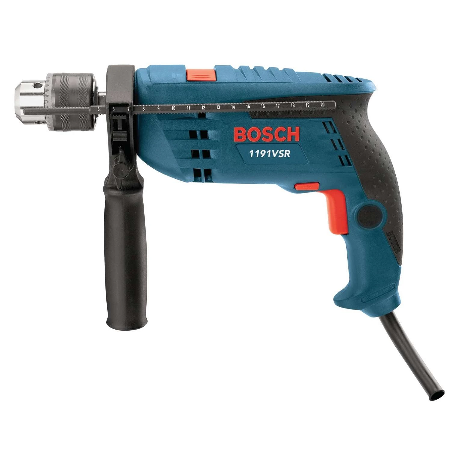 The Bosch 1191VSRK Hammer Drill delivers outstanding performance-to-weight ratio. It is a 4.1 lbs. hammer with a 7 amp motor that produces 0-48,000 no-load blasts per minute and no-load drilling speed of 0-3,000 RPM. This drill supplies a 360 degree locking auxiliary handle with a built-in, quick-release depth gauge. This easy-to-handle drill has a dual-mode selector, which easily converts the tool from rotation-only to hammer-drill mode. The variable-speed trigger with reversing allows accurate bit stars as well as removing fasteners, as this tool has a metal front housing for longer life and a heavy-duty keyed chuck for secure drilling. This hammer drill works with Bosch Pro+Guard dust system to help users move toward OSHA Silica Table 1 dust compliance. Ball-and-roller bearing construction – provides smooth power transmission and extended tool life Variable-speed trigger with reversing – allows for accurate bit starting as well as removing fasteners or bound bits Durable keyed 1/2 in. three-jaw chuck – provides secure bit grip in rugged applications