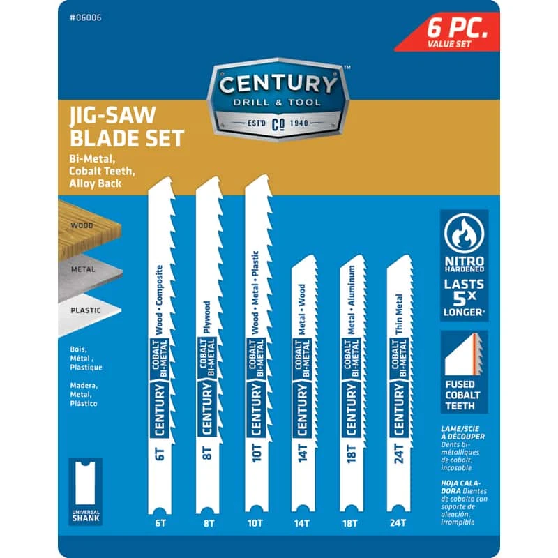 | Search Field | Century Drill & Tool Assorted in. Bi-Metal Universal Jig Saw Blade Set 6 TPI 6 pk Saw Blades Jig Saw Blades POWER SAW BLADES JIGSAW BLADES CENTURY DRILL & TOOL LLC Century Drill & Tool |