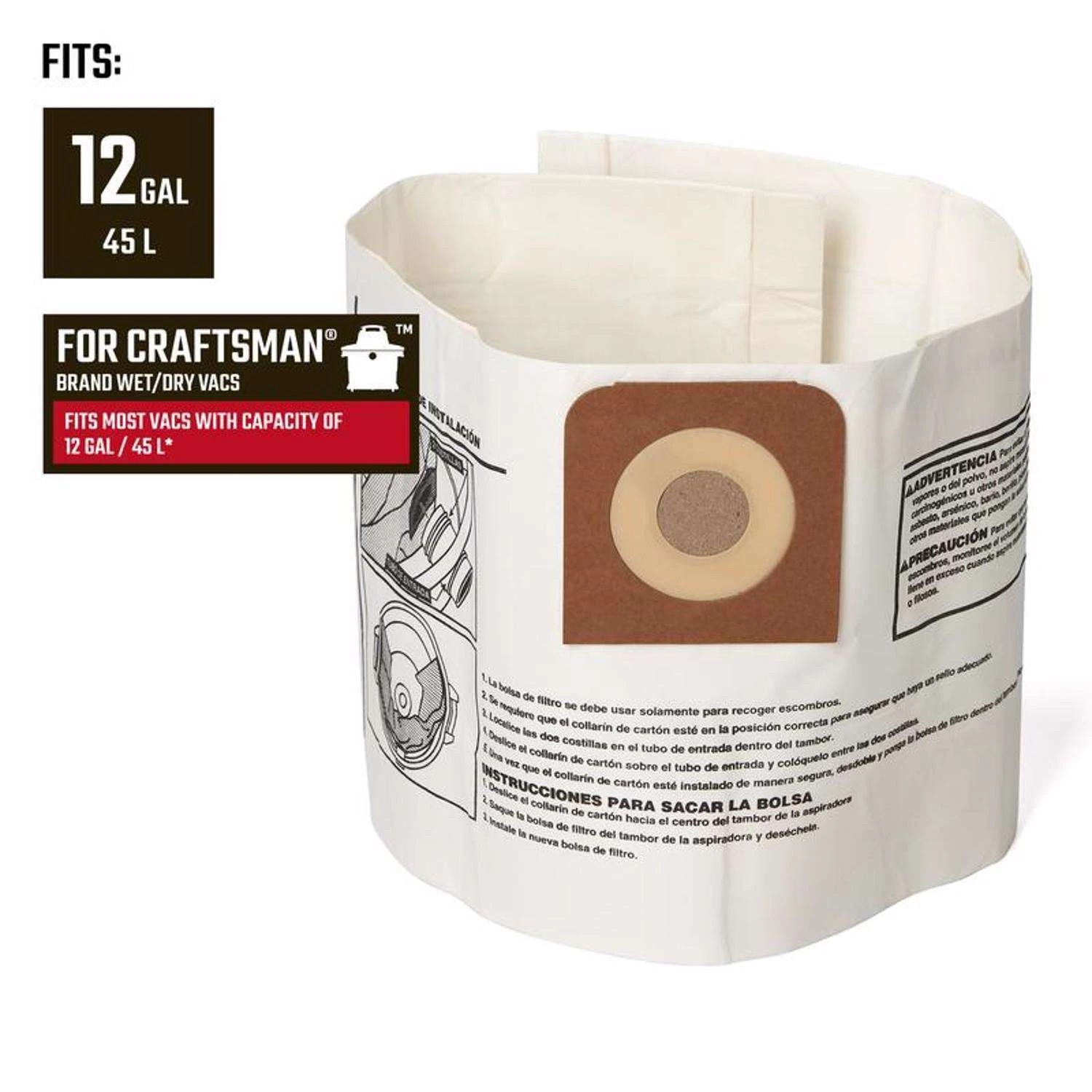 Craftsman 2 In. L X 11 In. W Wet/Dry Vac Dust Bag 12 Gal 2 Pc