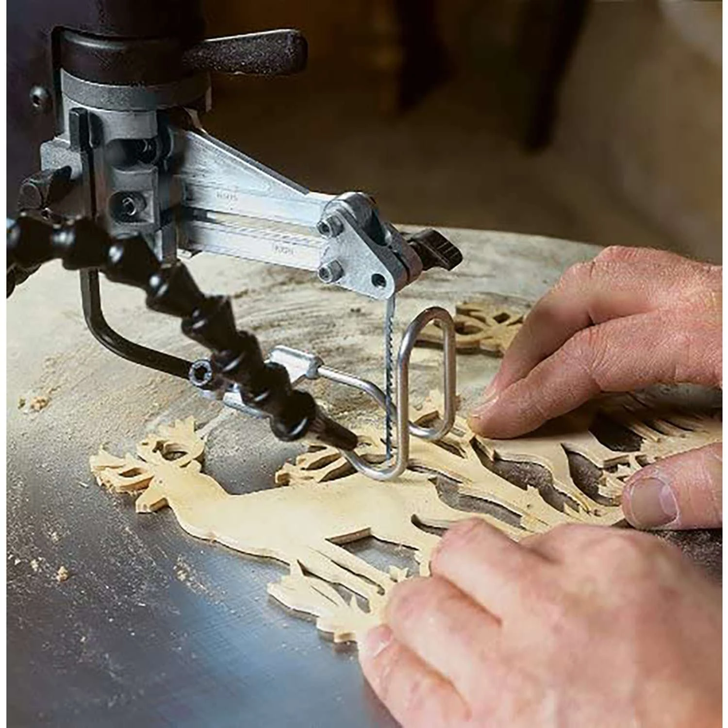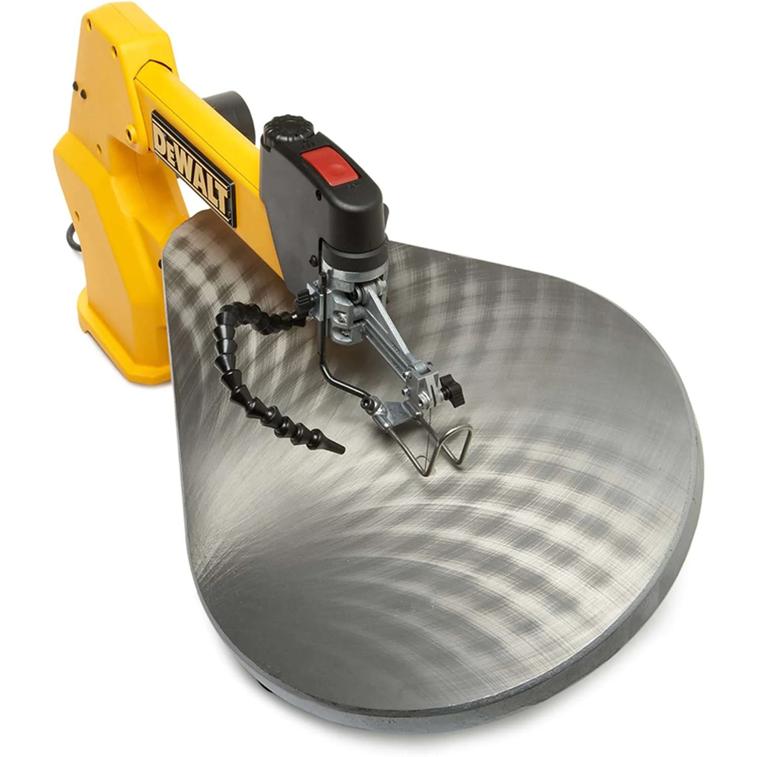 The DW788 20 in. Variable-Speed Scroll Saw operates quietly and smoothly for accuracy. The tool-free blade clamp allows for quick and easy blade changes. Convenient placement on the liftable arm of the dust blower, power switch, and saw adjustments on the front of the upper arm provide for easy adjustment. Oversized, cast-iron table provides excellent material support and has the ability to bevel to both the left and right. Double parallel-link arm design dramatically reduces vibration and noise for extremely accurate cuts Cast-iron table bevels 45 degrees (left and right) On-off switch, electronic variable speed, flexible dust blower and blade-tensioning lever are all located on the front upper arm Arm lifts so that blade can be easily threaded through the material for inside cuts Arm design keeps the blade perpendicular to the work, dramatically reducing over or under cutting