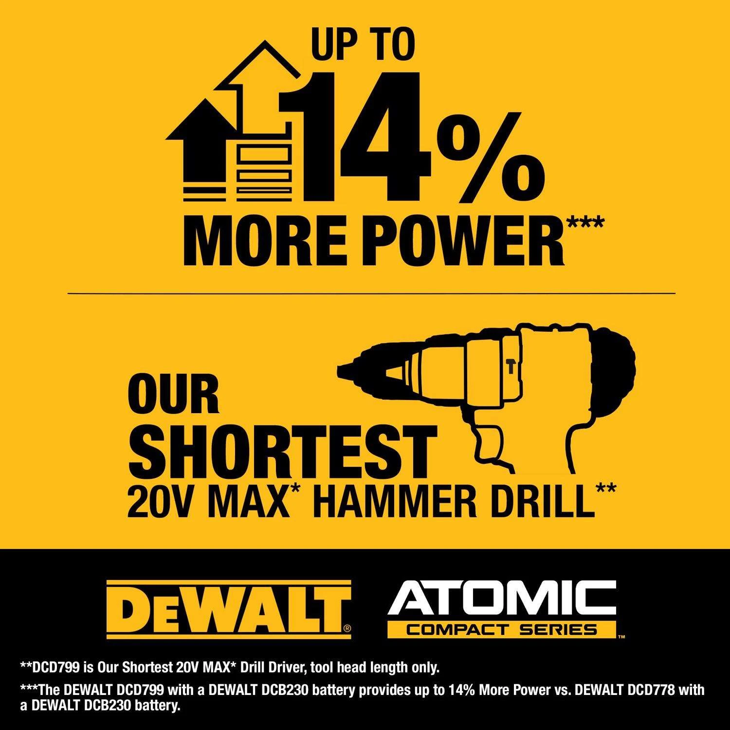 | What's Included | (1) DCD799 Atomic Compact Series 20V MAX Brushless Cordless 1/2 in. Hammer Drill, (1) DCB230 20V MAX 3.0Ah Battery, (1) DCB112 Charger, (1) Belt Hook and (1) Kit Bag |