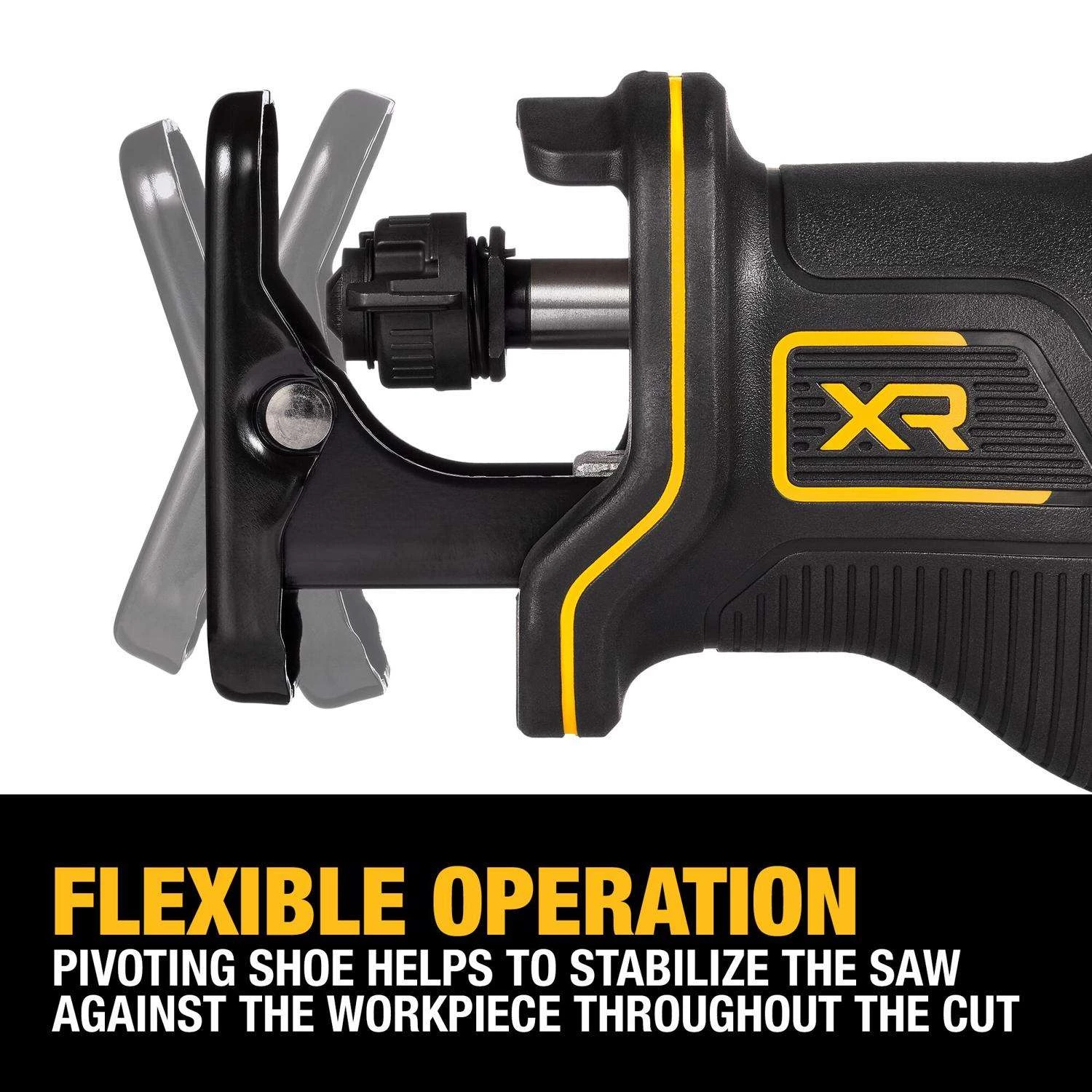 From light construction to demolition, the 20-Volt Max. XR Brushless Cordless Reciprocating Saw delivers the cutting power and maneuverability needed by pros like you for challenging projects. This versatile Reciprocating Saw’s brushless motor packs the muscle for a wide range of applications. Make quick cuts with its 1-1/8 in. stroke length and its lightweight build. Change blades easily and maintain high productivity with a variable speed trigger that offers optimized control as you work. Battery and Charger are sold separately. Get more work done with the stout brushless motor 2-finger variable trigger design offers ease of use Brighten dark workspaces with on-board LED Compact size designed for a high range of motion Flexible operation – pivoting shoe helps to stabilize the saw against the workpiece throughout the cut