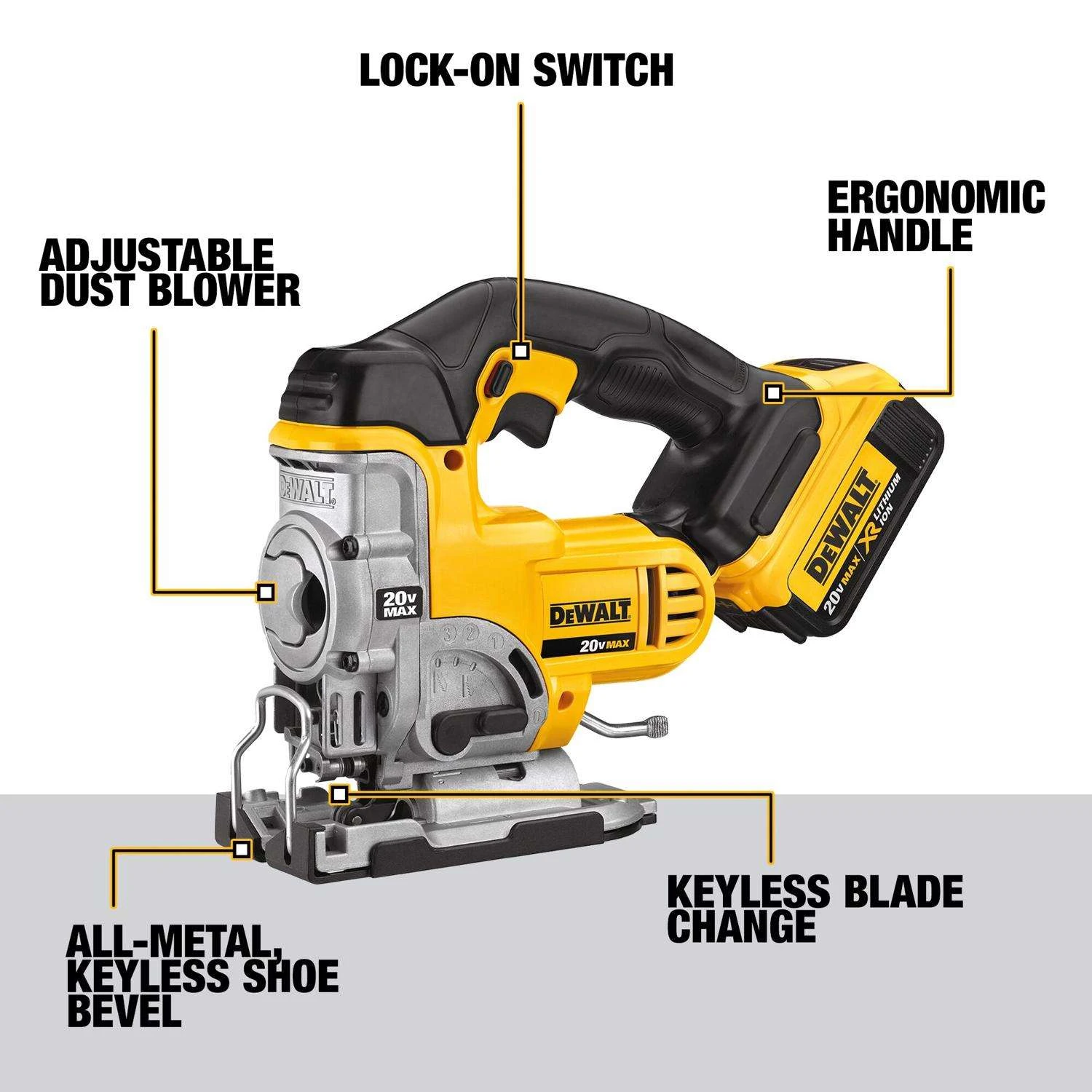 | What's Included | (1) DCS331 20V MAX Jig Saw, (1) DCB204 20V MAX Premium XR Li-Ion Battery (4.0Ah), (1) Charger, (1) Blade, (1) Kit Bag |
