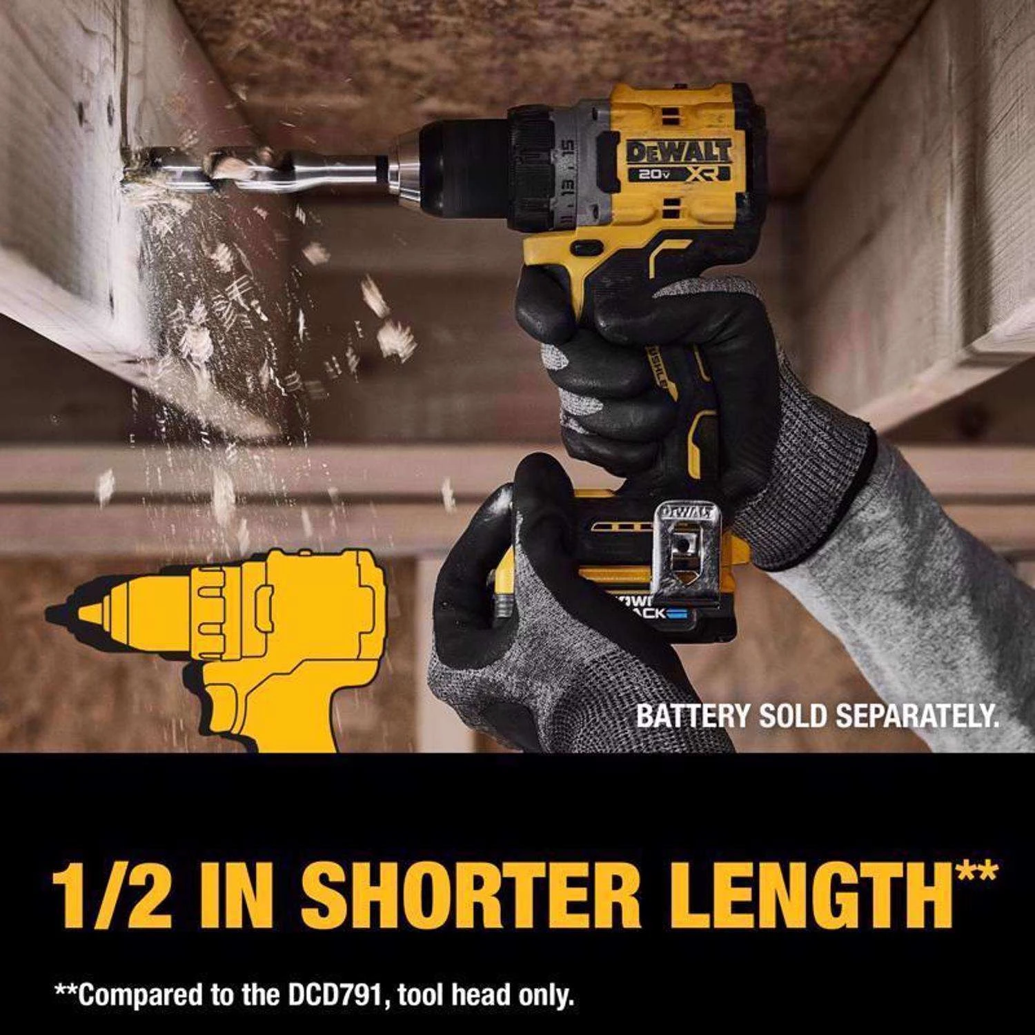 Engineered for professional-grade performance, the 20V Max XR brushless 1/2 in. Drill/Driver delivers the power and speed needed for heavy-duty drilling and fastening applications. Compared to the DeWalt DCD791B using DCBP034 DeWalt PowerStack battery (sold separately). Complete a wide range of drilling jobs with this versatile power tool, which outputs up to 2,000 rpm when drilling into wood and metal. This lightweight, well-balanced Drill/Driver was built compact to help users comfortably work in tight spaces for extended periods of time. The 3-position, pivoting LED is designed to enhance visibility in dimly lit work areas with its 3 mode settings and up to 70 Lumens of brightness. Complete challenging projects with up to 40 percentage more UWO High bit retention with 1/2 inch metal ratcheting chuck Designed to help you get more done with optimized performance and runtime