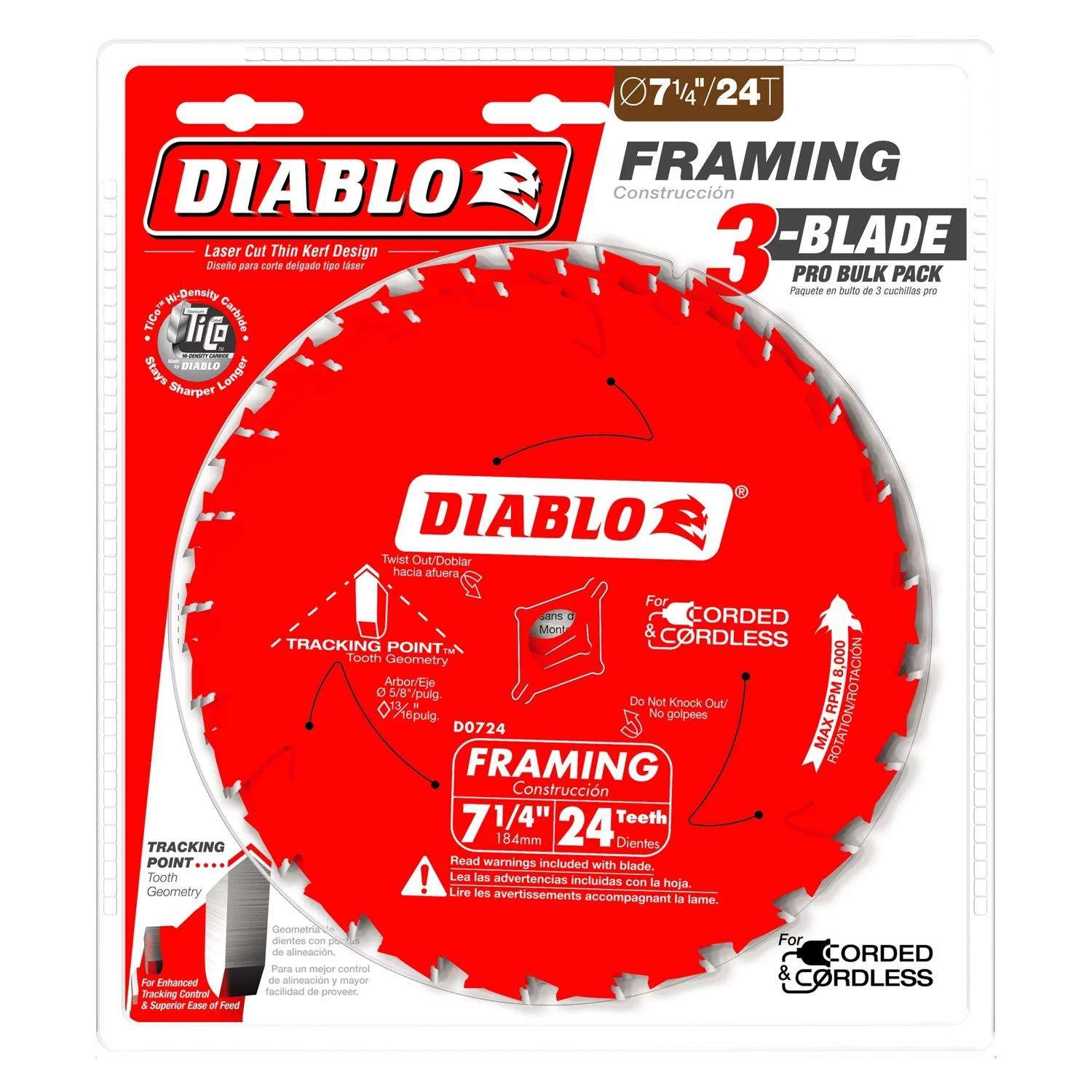 Diablo Tracking Point 7-1/4 In. D X 5/8 In. TiCo Hi-Density Carbide Framing Saw Blade 24 Teeth 3 Pk