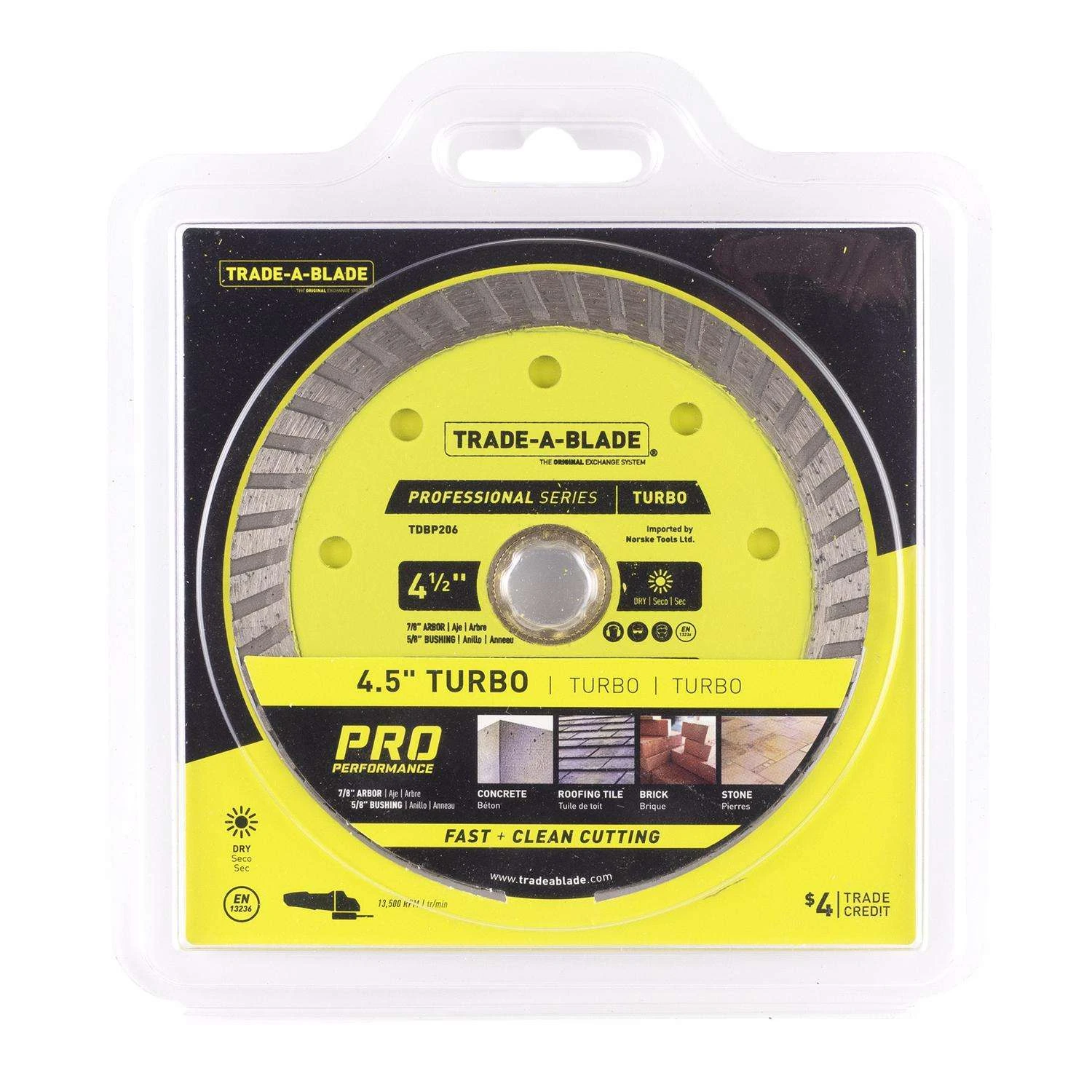 Be the first to review “Trade A Blade 4-1/2 In. D X 5/8 And 7/8 In. Diamond Turbo Rim Blade 1 Each” Cancel reply